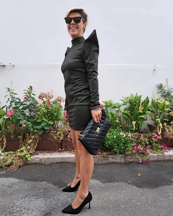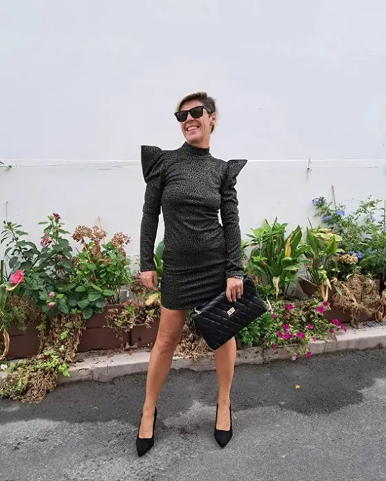 Vestido en verde kaki con estampado de animal print. Manga larga y ligeramente abullonada. Con espalda abierta y botones para atar en el cuello.