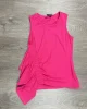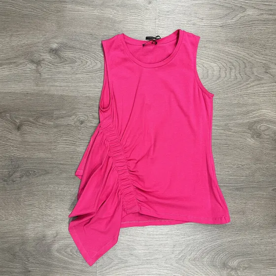 Camiseta sin mangas de algodón en fucsia, con fruncido en un costado y detalle de volante en cascada.