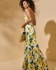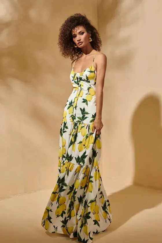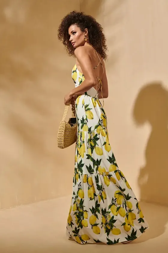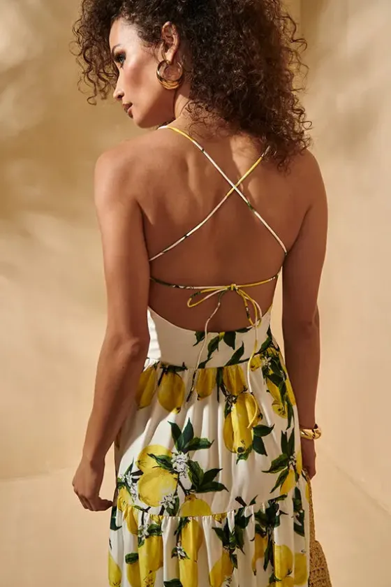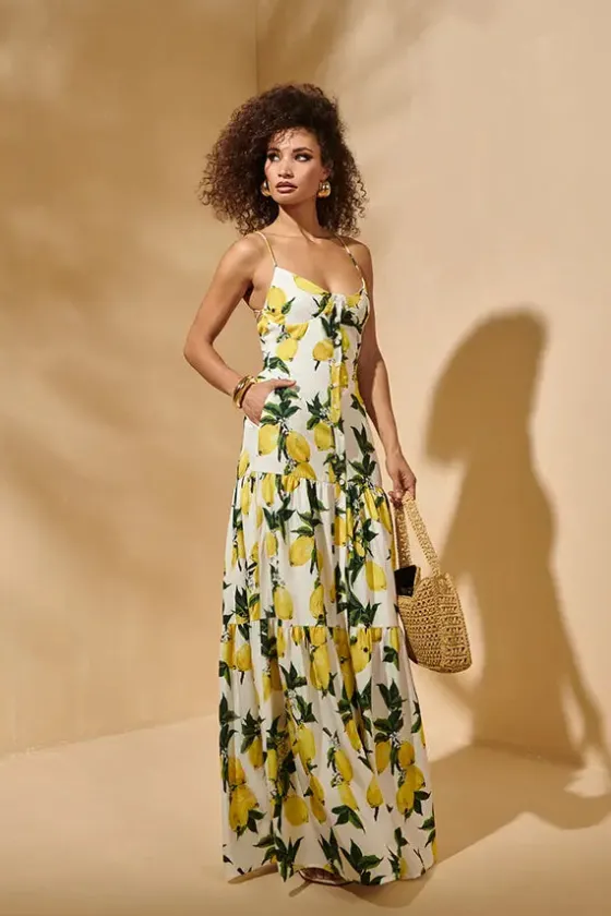 Déjate llevar por el encanto de la costa italiana con el Capri Maxi Dress. Un vestido largo con estampado de limones vibrantes sobre fondo blanco, ideal para brillar bajo el sol. Su escote ajustado, tirantes finos cruzados en la espalda y abertura frontal crean una silueta fresca, femenina y súper favorecedora.