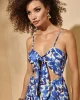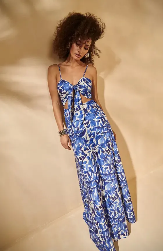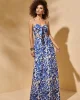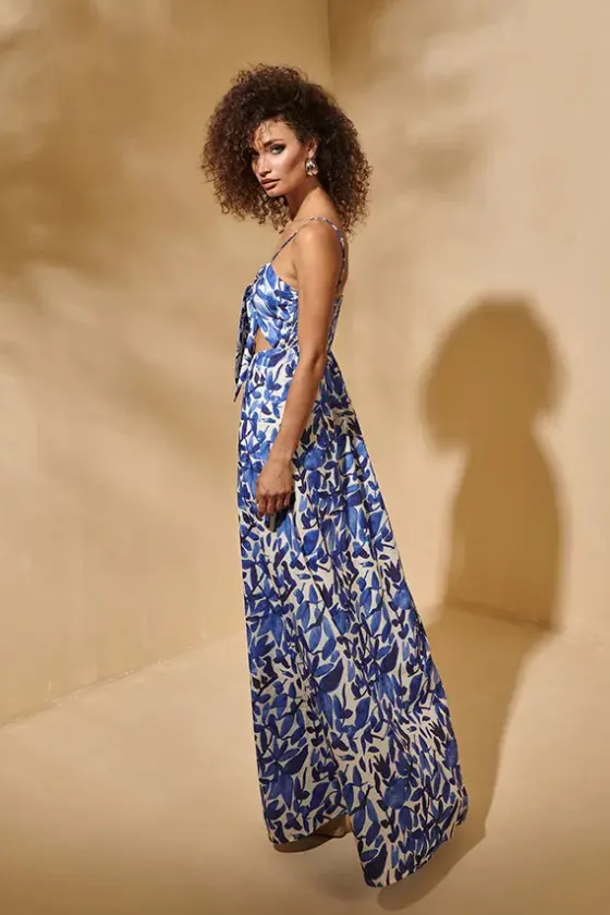 Vestido largo estampado azul con lazo frontal y aberturas – Floral Sky Dress