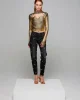 Jersey en punto canalé en dorado metalizado. Con elástico en bajo. Cuello perkins y abertura en escote con forma. Abertura en puño para sacar el dedo. ç