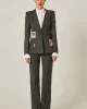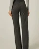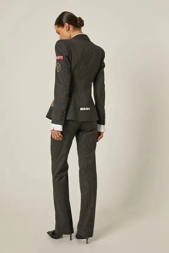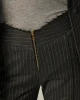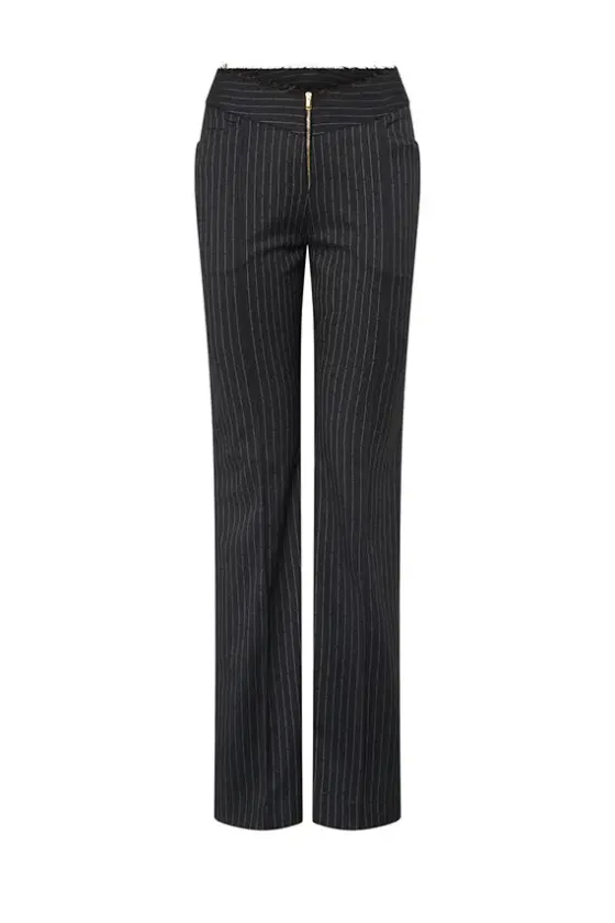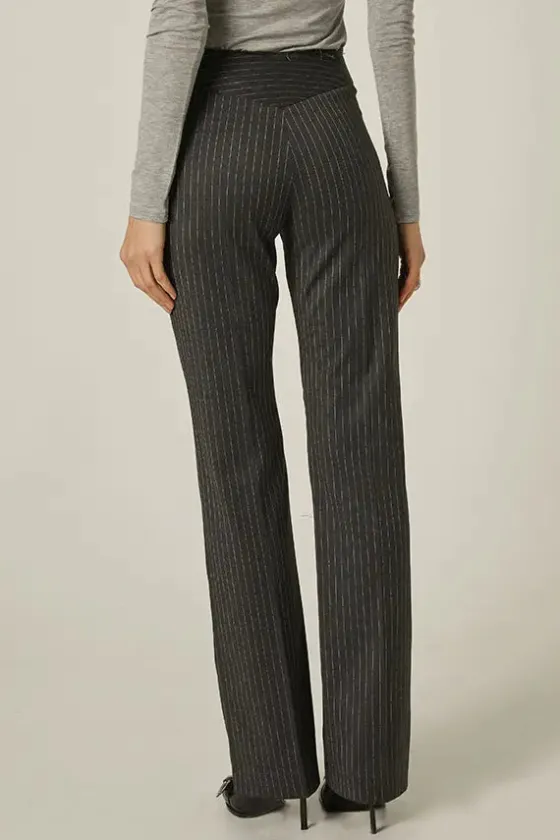 - Pantalón de corte recto, ajustado y de tiro bajo en forma de pico con diseño en raya diplomática.