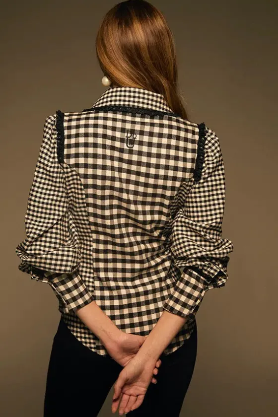 - Detalle de puntilla en encaje negro en el cuello, sisas y puños.