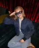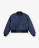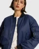 - Chaqueta bomber en azul marino, confeccionada con un tejido de nailon grueso.