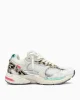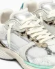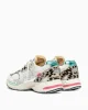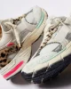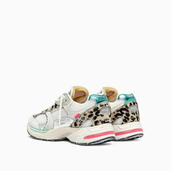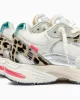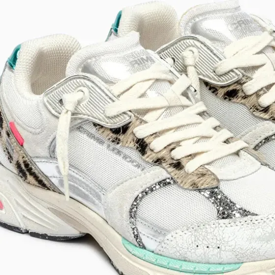 - Parte superior de tela blanca, ante y craquelado con piel de becerro con estampado de león y detalles de piel laminada plateada