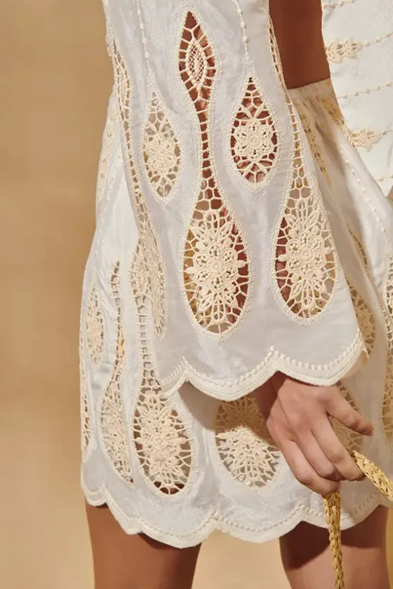 El Bohemian Sunrise Dress White es una joya de inspiración bohemia con un aire fresco, delicado y sofisticado. Su diseño en color blanco incluye bordados geométricos troquelados, mangas largas acampanadas, y una abertura lateral y trasera que aporta sensualidad sin perder elegancia.
