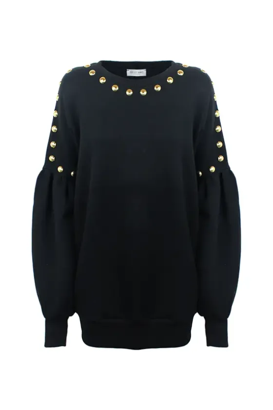 - Detalle de tachuelas doradas en el delantero, bordeando el cuello, hombros y el corte en la manga.