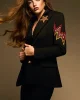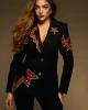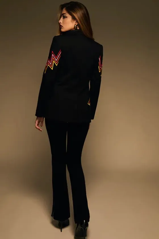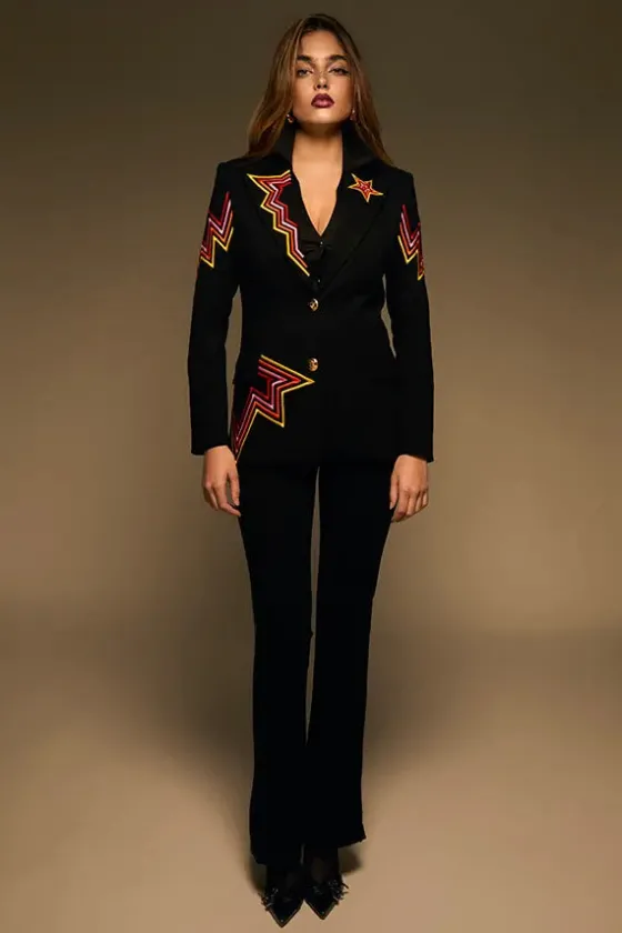 - Bordados por diferentes partes de la blazer de estrellas y picos en colores vivos (rojo, rosa, naranja y amarillo).