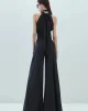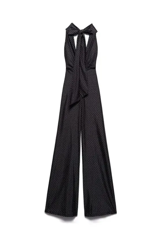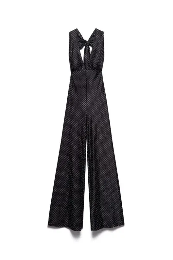 El mono Leila juega con proporciones atrevidas y detalles femeninos para aportar una elegancia exclusiva a las ocasiones de noche. Su silueta presenta un escote en pico pronunciado que se ata con un lazo oversize en la espalda, se ajusta a la cintura y fluye hasta una amplia pernera palazzo.