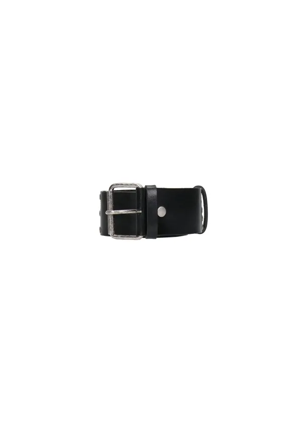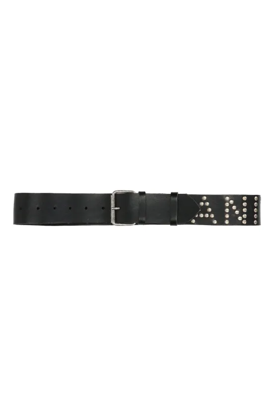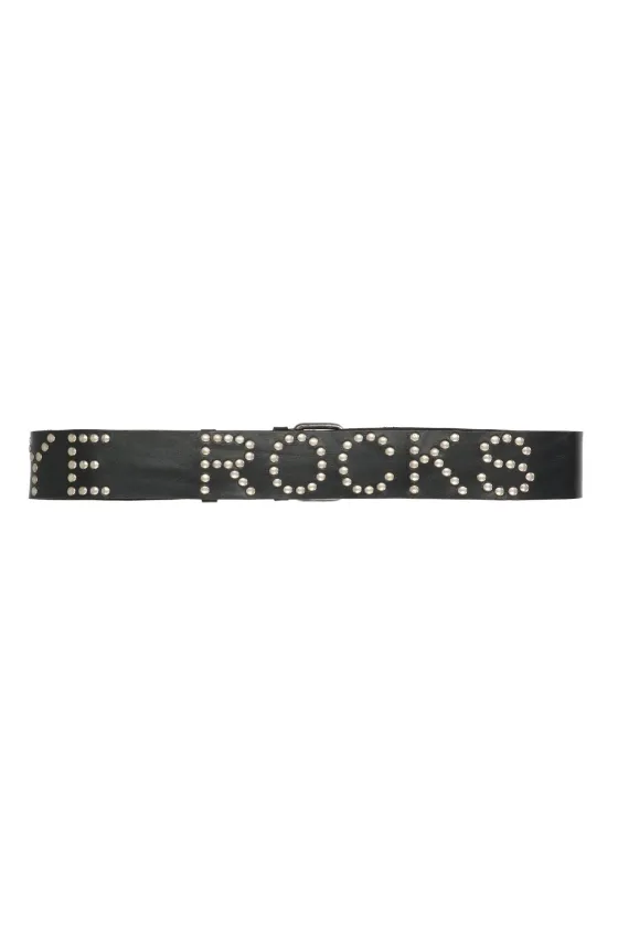Cintur贸n negro en piel, con tachuelas en plata con la inscripci贸n 芦Aniye Rocks禄.