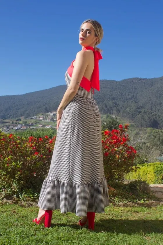 Nuestro vestido Cibeles de cuadro vichy y fucsia es la prenda perfecta para cualquier ocasi贸n.(en la foto se ve mas rojo la cinta del cuello pero es fucsia fl煤or) Su escote halter y cinta que anuda al cuello hacen que sea un vestido muy favorecedor para todo tipo de figuras. Adem谩s, su tama帽o maxi y dise帽o de botones traseros le dan un toque elegante y sofisticado. Este vestido es una opci贸n excelente para lucirte en bodas, fiestas de graduaci贸n, eventos de trabajo o cualquier ocasi贸n especial.