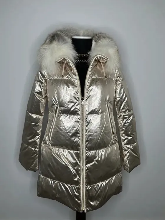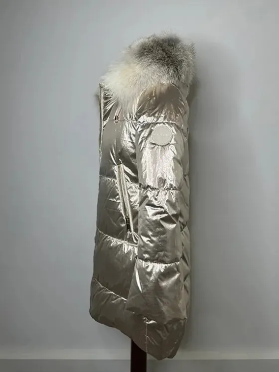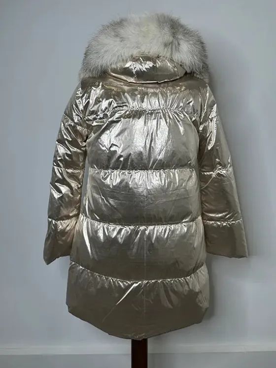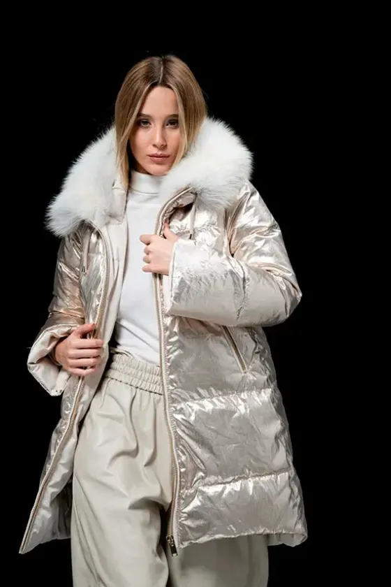 - En un tejido técnico dorado tornasolado que no puede ser más divino y elegante. Con bolsillos en los costados con cremallera.