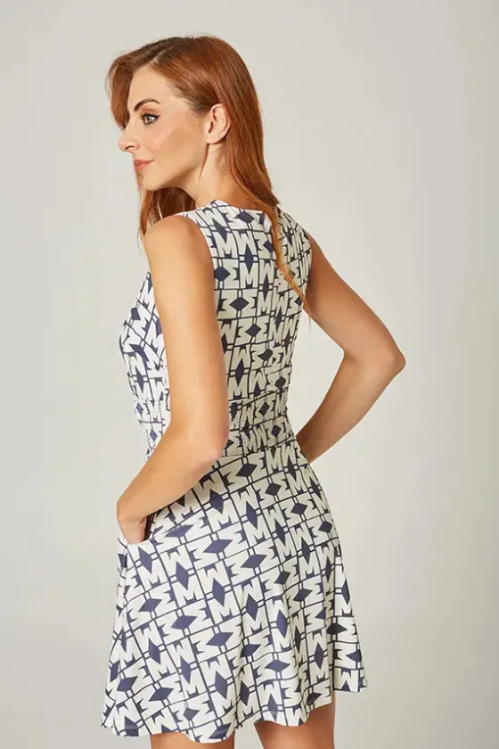 - Fondo gris petróleo con estampado de la inicial de la marca en crema.