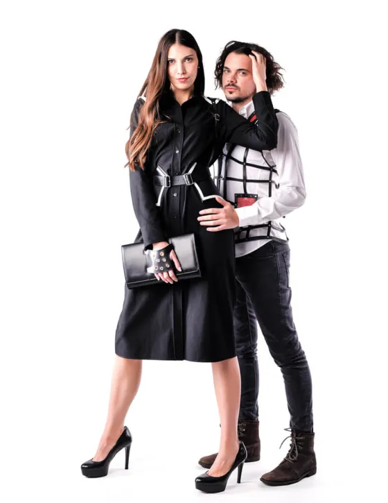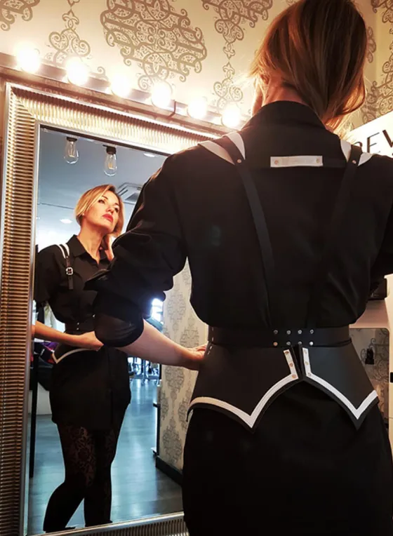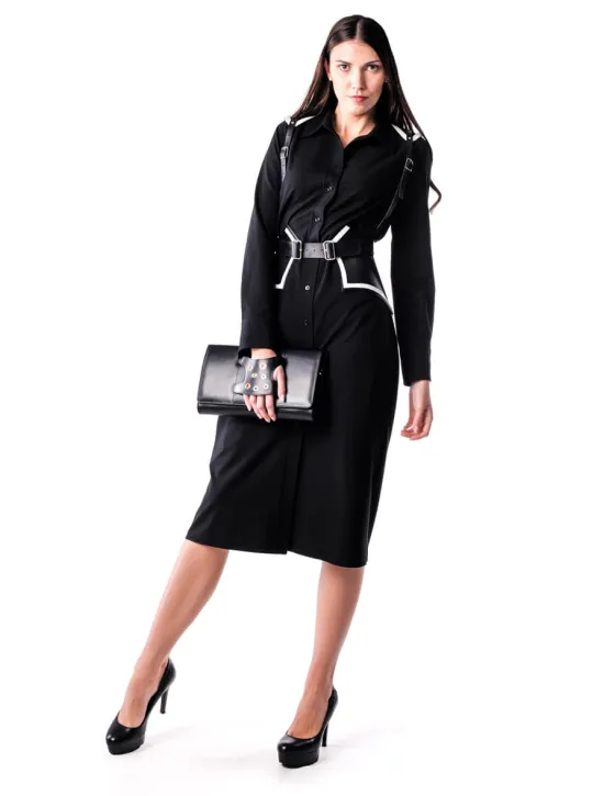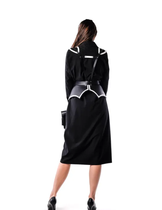 Son piezas hechas a mano, 100% piel de vacuno y teñidas con tintes vegetales. Arnés en negro con vivo blanco en el canto. Detalle en los hombros con vivo al contraste también. Regulable con dos hebillas en el delantero y los tirantes con sus respectivas hebillas.