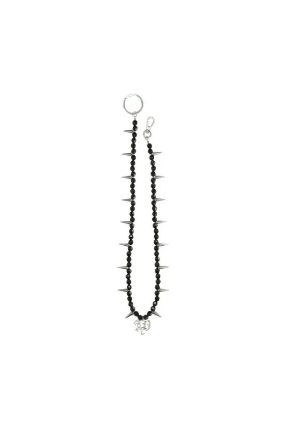 - LLavero/collar con perlas geométricas en negro y tachuelas puntiagudas.