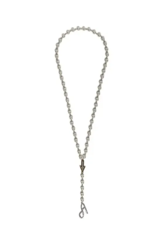 Este collar inspirado en un rosario expresa el espíritu lúdico de Aniye By. Las románticas perlas se yuxtaponen con un llamativo colgante con forma de flecha y logotipo de diamantes de imitación en pavé.