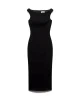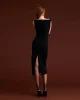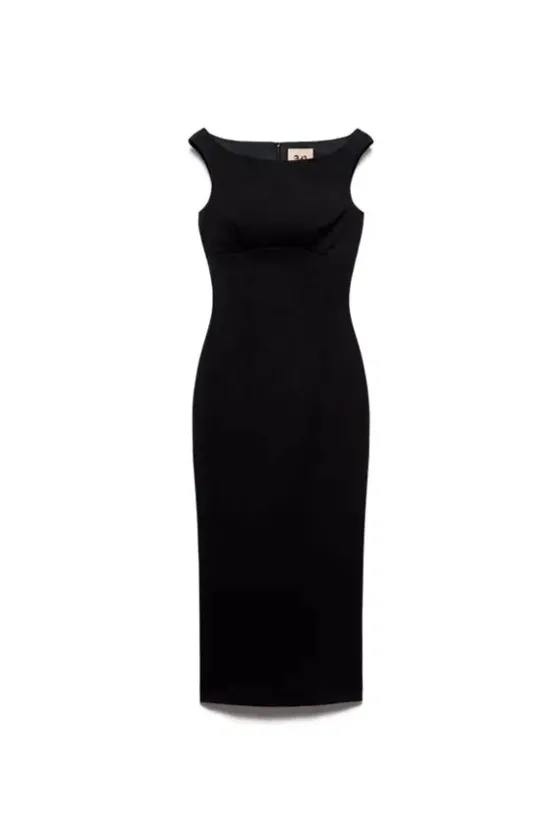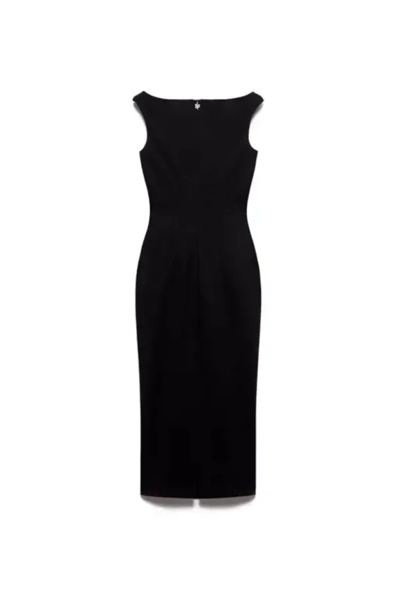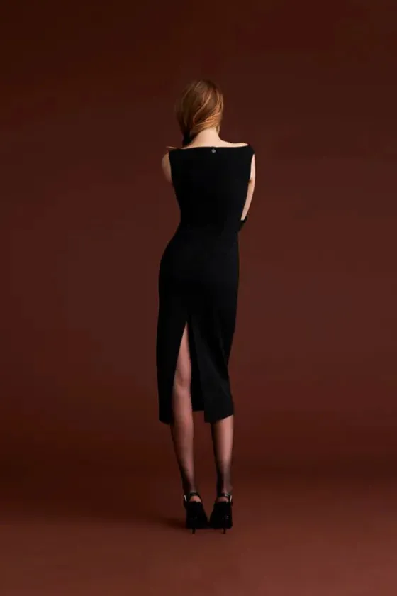 El vestido midi Sienna explora los contrastes entre estructura y seducción. El escote tipo barco traza una delicada curva que roza las clavículas, mientras que el tejido elástico sigue la silueta con una precisión elegante. La cremallera trasera, de corte limpio, realzada por un tirador de cremallera de la marca, añade un detalle gráfico con la personalidad de Aniye By.