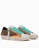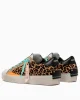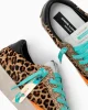 - Parte superior de piel de becerro con estampado de leo y detalles de charol en color naranja fluorescente y brillo dorado.