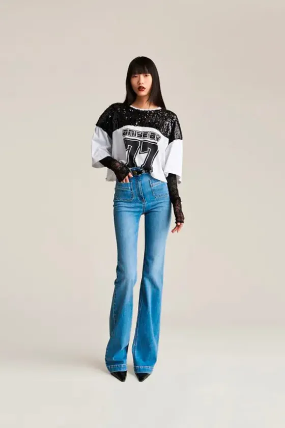 La camiseta de rugby Aniye combina un corte atl茅tico con detalles femeninos. El cuerpo de algod贸n presenta un panel de lentejuelas en la parte delantera, con un logotipo estampado en el pecho, mientras que el cuello redondo mantiene el look limpio. Las mangas largas de encaje dan a la prenda un toque oscuro y elegante.