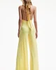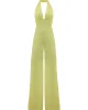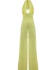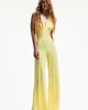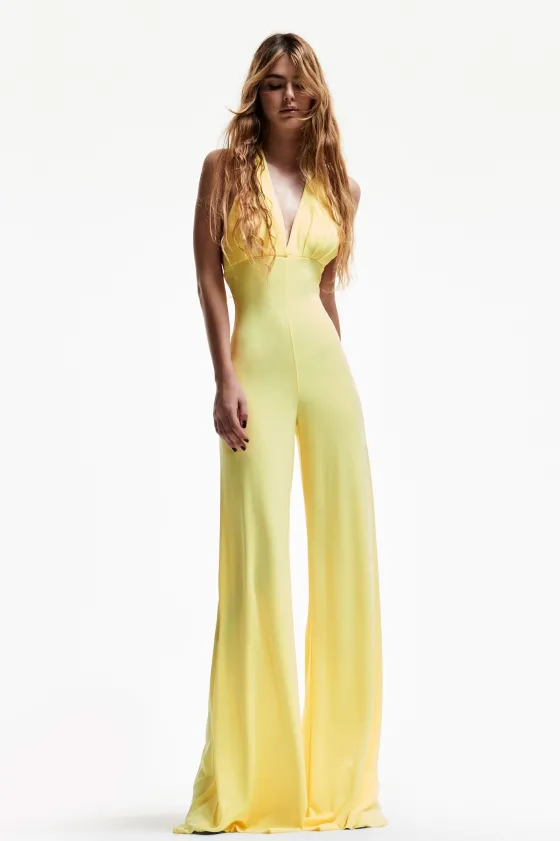 Mono amarillo, con escote V y lazada para anudar en el cuello. Palazzo con una caídamaravillosa.
