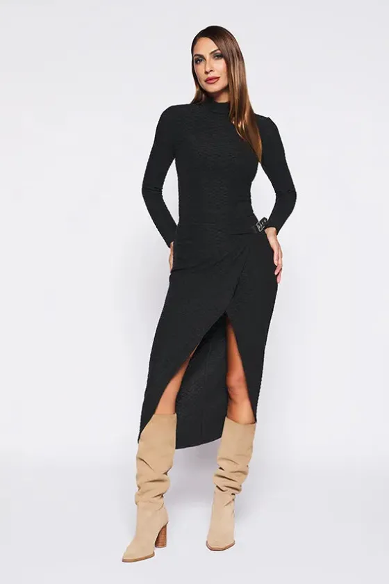 - Falda midi. Montada en el delantero haciendo abertura central.