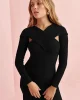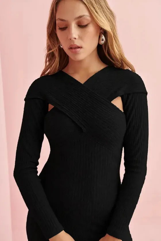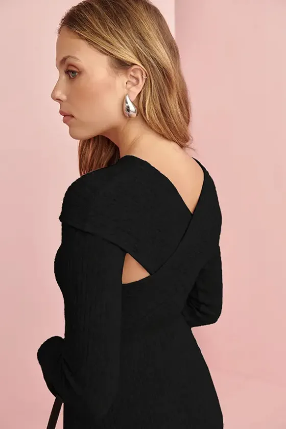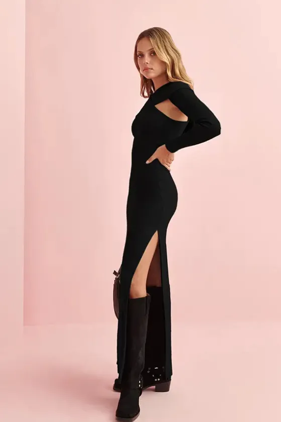 - Vestido de punto largo con un diseño asimétrico y mangas largas, perfecto para eventos elegantes o salidas nocturnas.