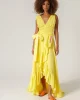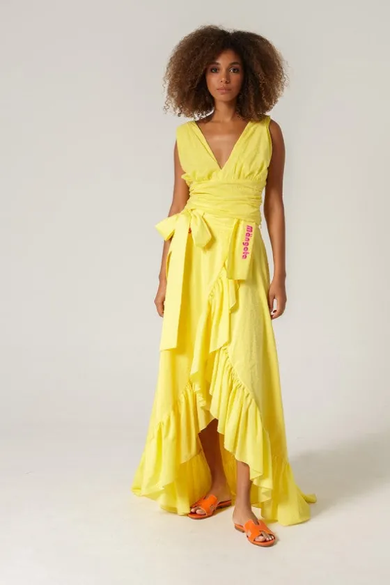 Top en tejido de algod贸n en color amarillo. Escote en delantero y espalda en forma de V. Faj铆n con bordado en tono fucsia. Cierre mediante cremallera lateral. Forro interior.