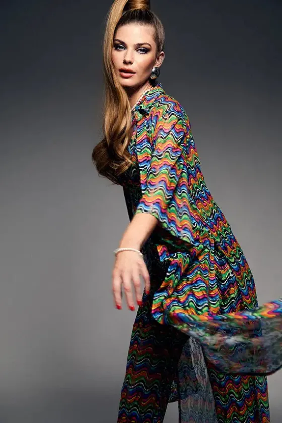- Kimono en un estampado multicolor muy favorecedor.