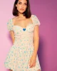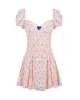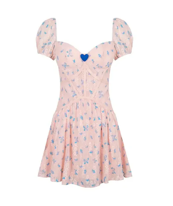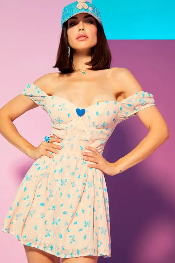 - Vestido corto en color nude con estampado de mariposas en azul.