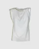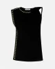 - La otra mitad bordeada con tachas doradas, desde el cuello hasta el bajo.