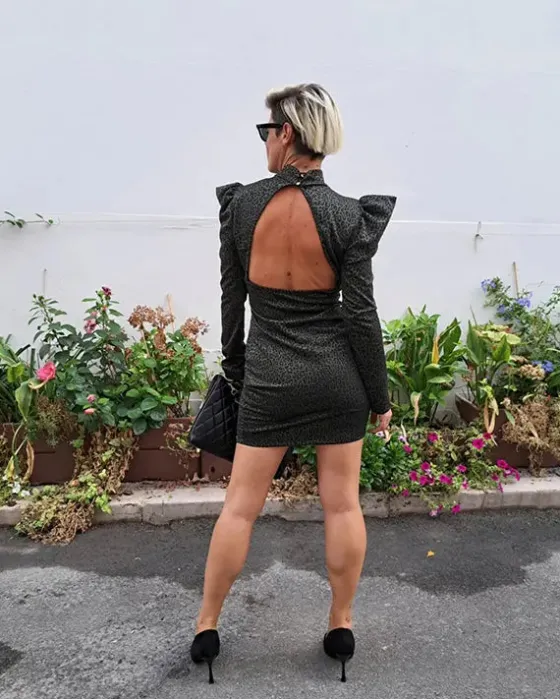 Vestido en verde kaki con estampado de animal print. Manga larga y ligeramente abullonada. Con espalda abierta y botones para atar en el cuello.