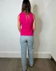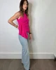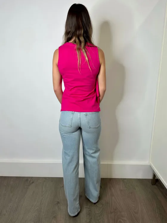 Camiseta sin mangas de algodón en fucsia, con fruncido en un costado y detalle de volante en cascada.