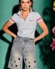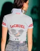 Polo de manga corta en tono azul claro con detalles de rayas rojas en las mangas y cuello clásico con cierre de botones. Su diseño combina un aire deportivo con un toque femenino y elegante, ideal para looks casuales y sofisticados.