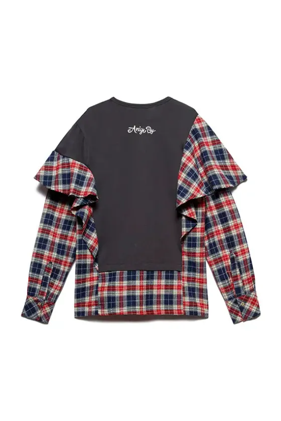 Rock y feminidad, todo a la vez. La camiseta de AC/DC transforma el look clásico en capas en una prenda llamativa y poco convencional. La parte delantera presenta un llamativo estampado de bandas con efecto camiseta, cosido sobre una base de camisa con estampado de cuadros, mangas largas y volantes aplicados. Está rematada con el toque característico de las letras Aniye By en la parte trasera.