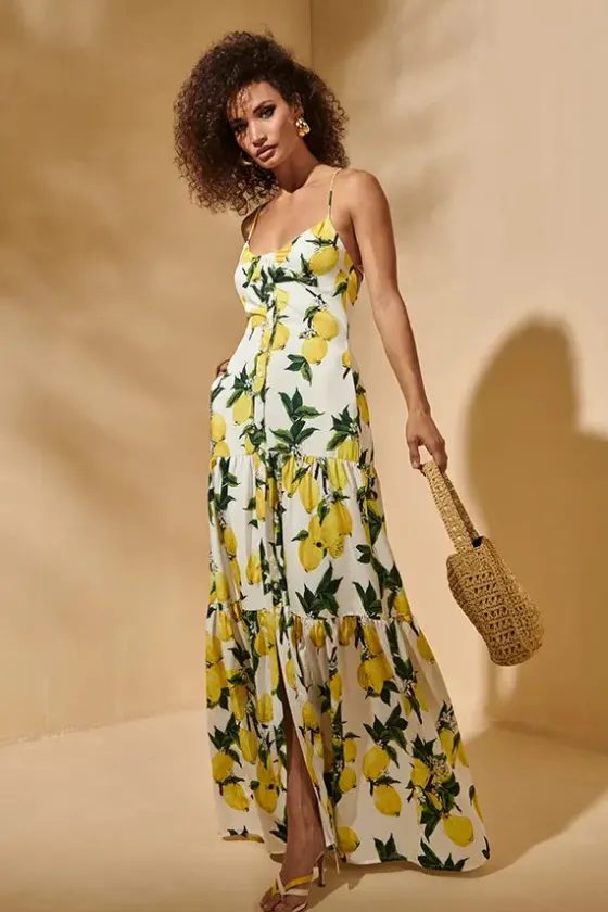 Déjate llevar por el encanto de la costa italiana con el Capri Maxi Dress. Un vestido largo con estampado de limones vibrantes sobre fondo blanco, ideal para brillar bajo el sol. Su escote ajustado, tirantes finos cruzados en la espalda y abertura frontal crean una silueta fresca, femenina y súper favorecedora.