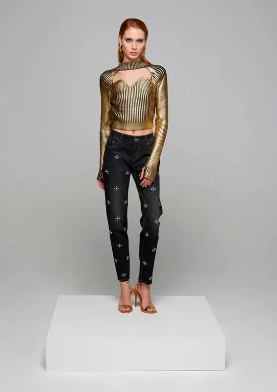 Jersey en punto canalé en dorado metalizado. Con elástico en bajo. Cuello perkins y abertura en escote con forma. Abertura en puño para sacar el dedo. ç