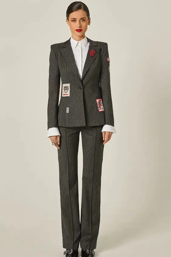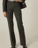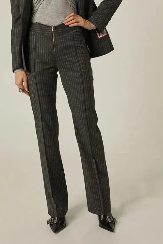 - Pantalón de corte recto, ajustado y de tiro bajo en forma de pico con diseño en raya diplomática.