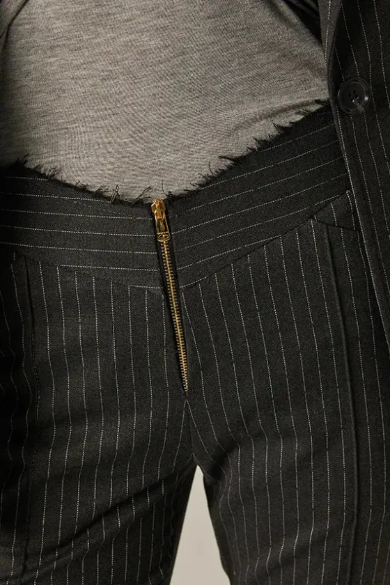 - La cintura del pantalón tiene un detalle distintivo en la parte superior, donde el borde está deshilachado el cual le da un toque moderno, contrastando con la formidad del resto del diseño.