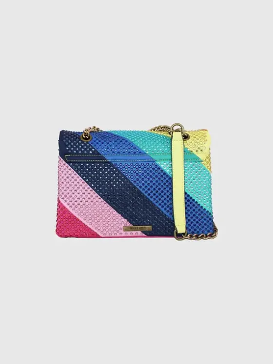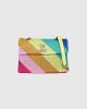 Bolsos confeccionados en un tejido suave con un patrón de rayas arcoíris en diagonal cosidas y rematadas con cristales tono sobre tono.