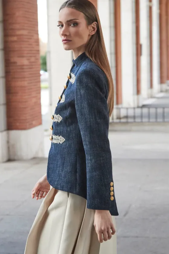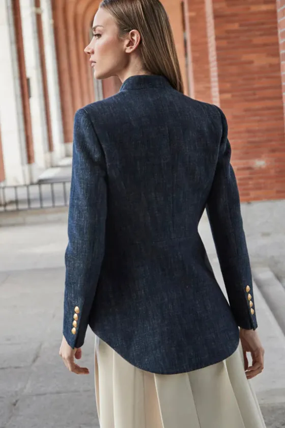 Su cuello mao alto y cerrado, sin solapas, dirige toda la atenci贸n hacia los cuatro botones dorados centrales, que aportan un aire de distinci贸n y car谩cter.