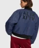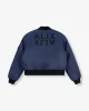 - Chaqueta bomber en azul marino, confeccionada con un tejido de nailon grueso.