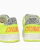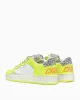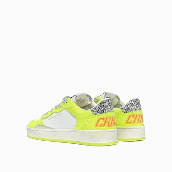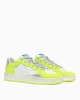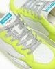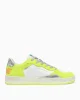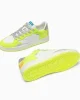 - Parte superior de cuero blanco con gamuza amarilla flúor, detalles de cuero laminado plateado