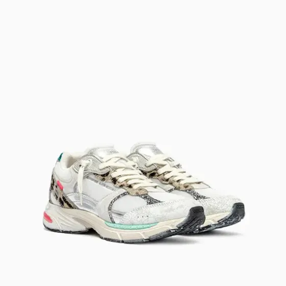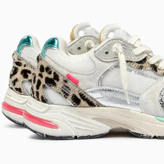 - Parte superior de tela blanca, ante y craquelado con piel de becerro con estampado de león y detalles de piel laminada plateada