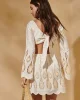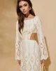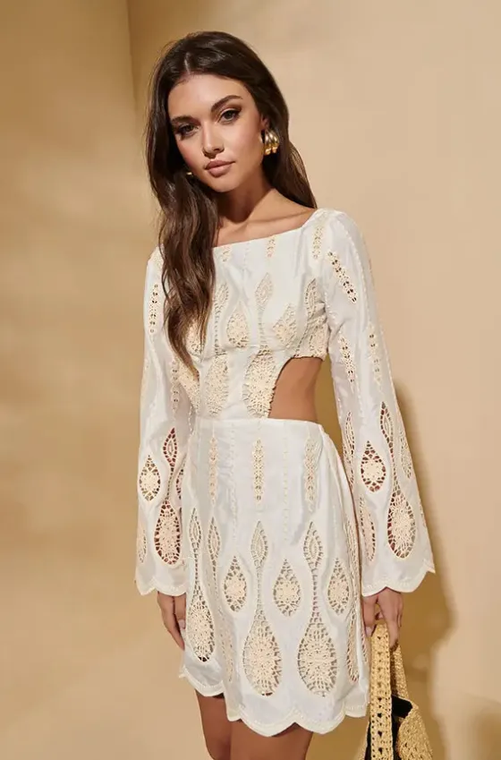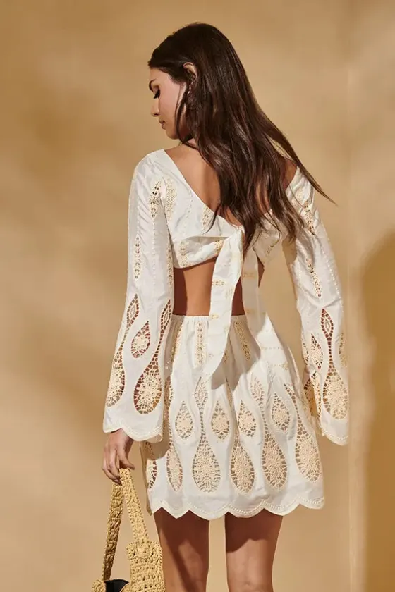 El Bohemian Sunrise Dress White es una joya de inspiración bohemia con un aire fresco, delicado y sofisticado. Su diseño en color blanco incluye bordados geométricos troquelados, mangas largas acampanadas, y una abertura lateral y trasera que aporta sensualidad sin perder elegancia.