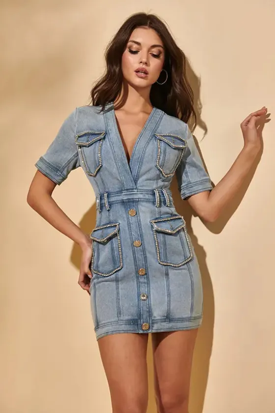 - Vestido en denim de manga corta y escote V.