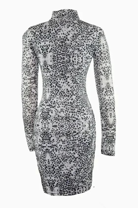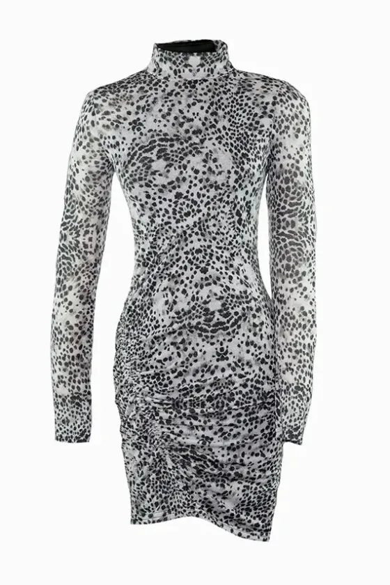 - Vestido estampado con mancha de animal print en tonos negros y grises.