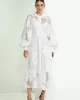 - En un tejido de encaje floral blanco con apliques de cristal cosidos a mano.
