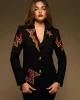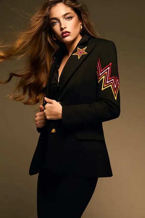 - Bordados por diferentes partes de la blazer de estrellas y picos en colores vivos (rojo, rosa, naranja y amarillo).