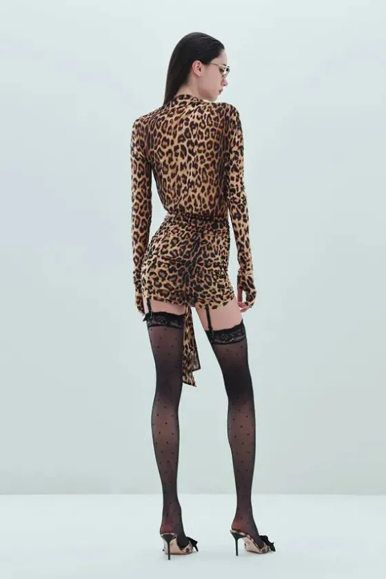 Da rienda suelta a tu lado salvaje con el minivestido con estampado animal Malindi, que luce una silueta ceñida al cuerpo con cuello alto, hombros drapeados y un espectacular detalle de fajín. Su falda voluptuosamente fruncida esculpe la silueta con seguridad y carisma.