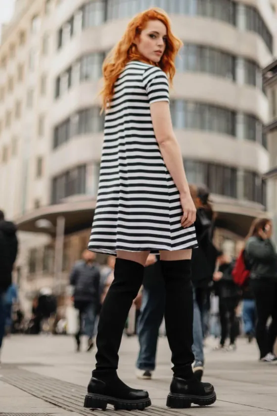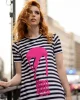 Vestido evasé con fondo a rayas en blanco y negro y Bowie central en contraste en fucsia. Volantes polipiel.